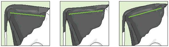 Atskaitos taškas: šonkaulių kampas ir jų išskėtimas (išlinkimas). Nepatikimas požymis.